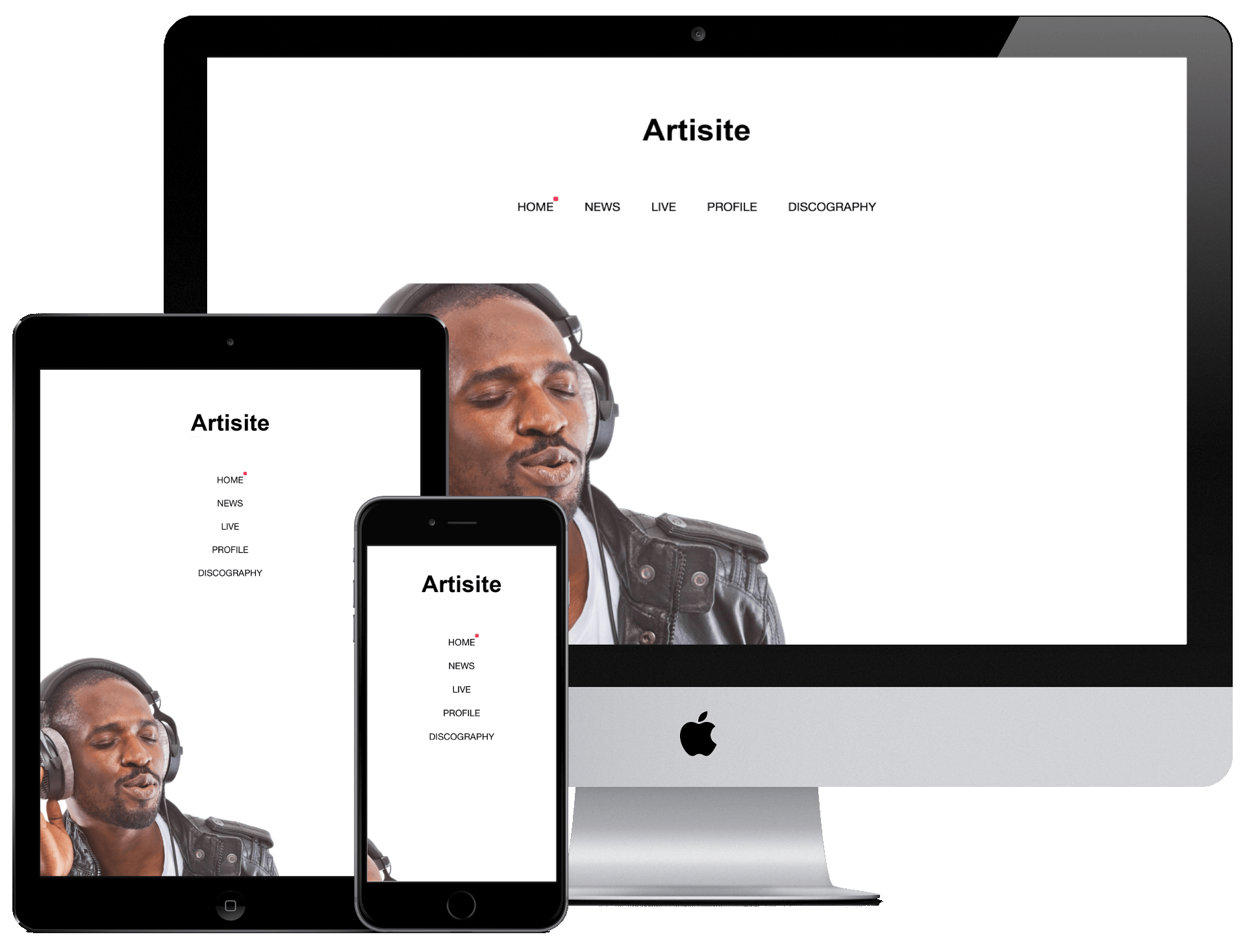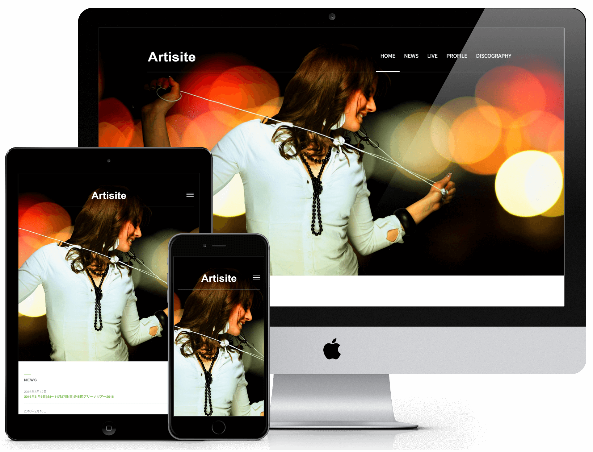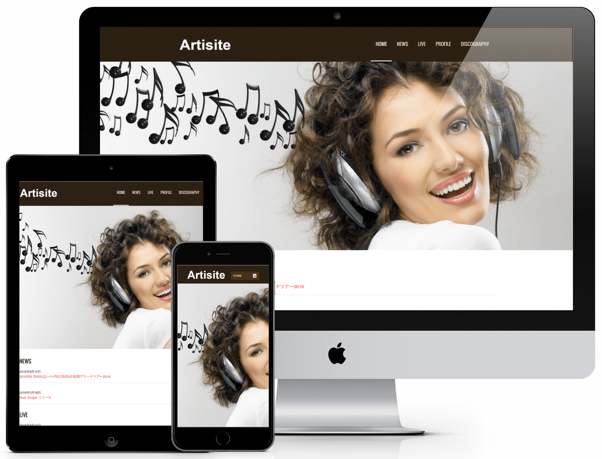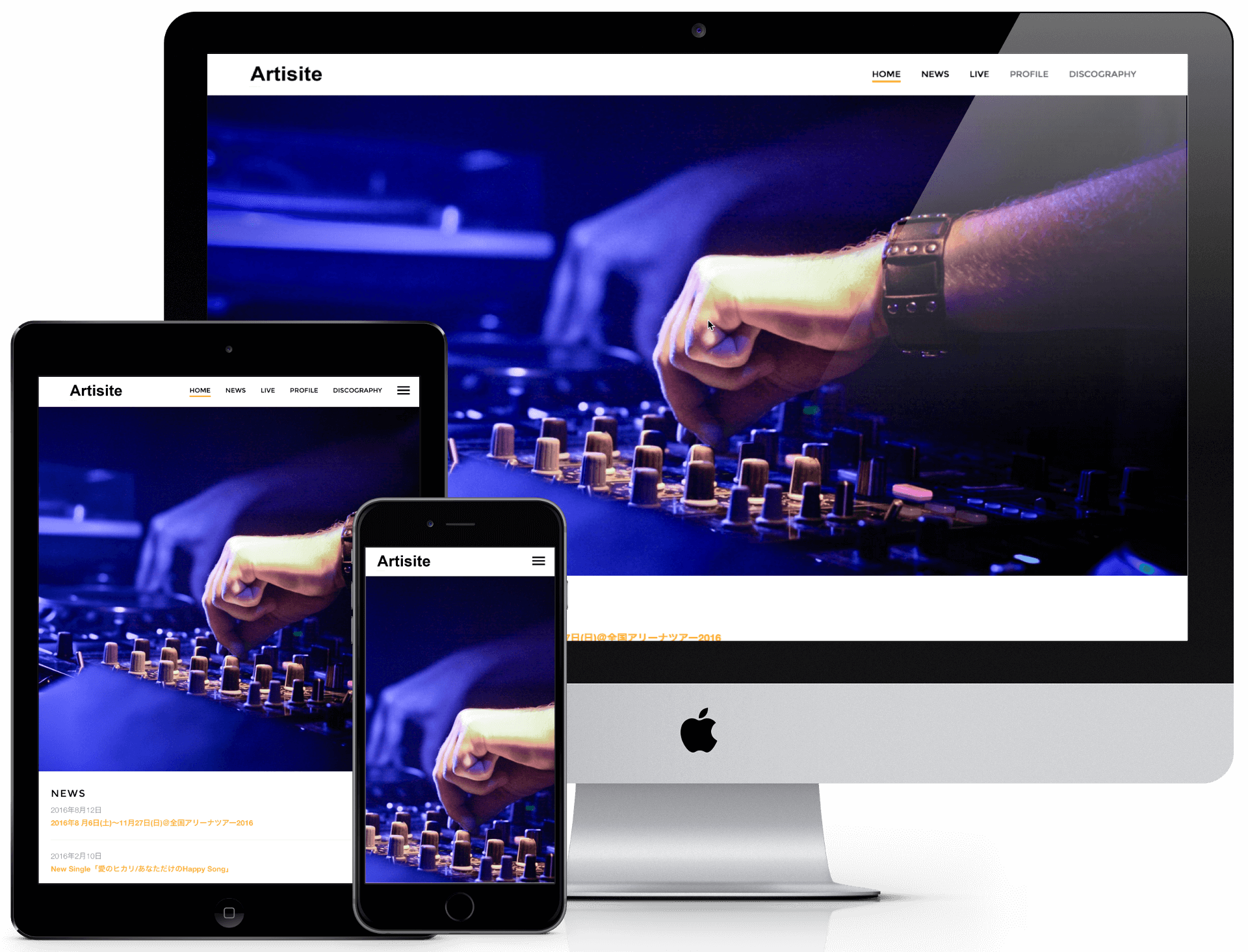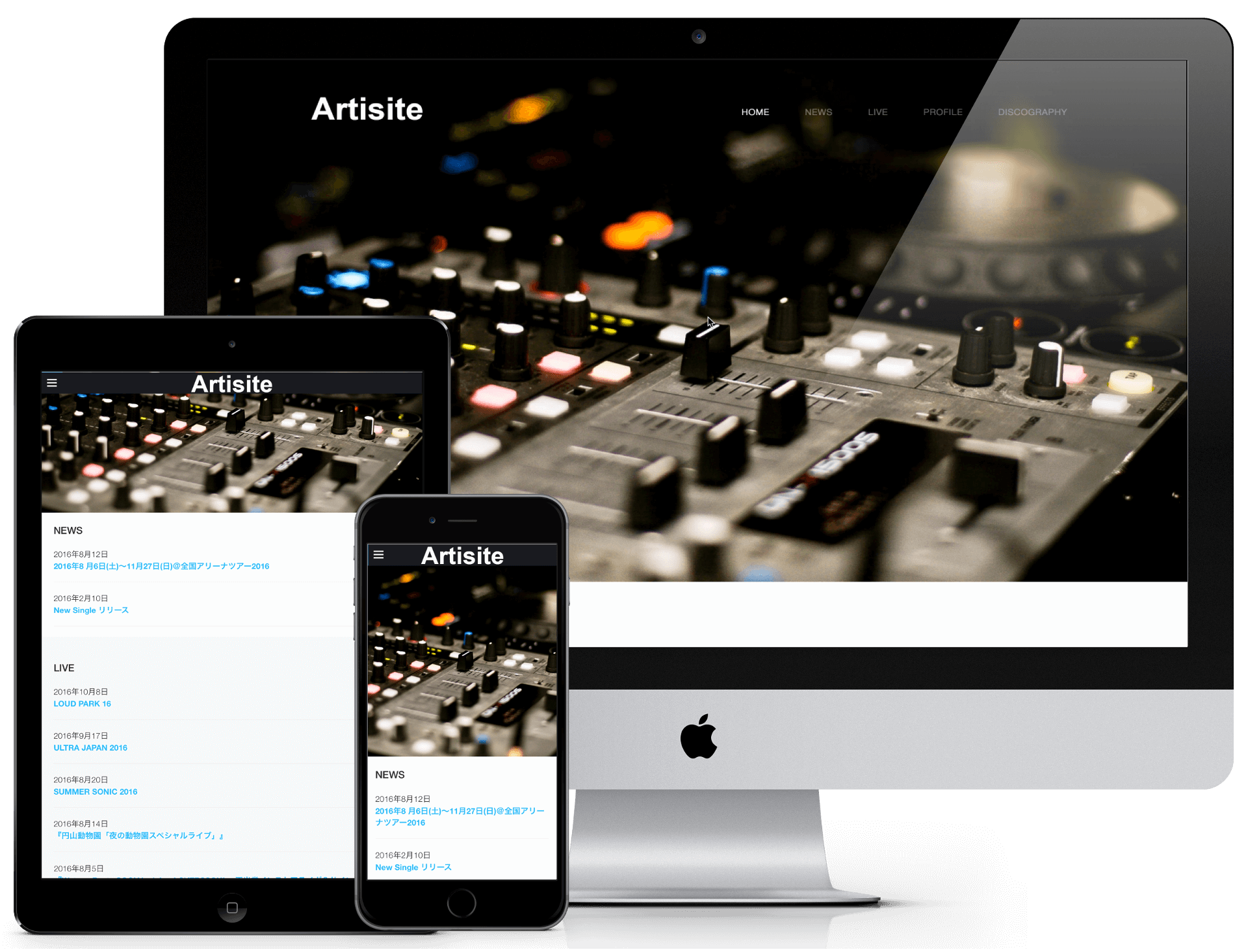 アーティストサイトに必要な「ニュース」「ライブ」「プロフィール」「ディスコグラフィ」「SNSリンク」の作成・編集が可能です。お問い合わせフォームも簡単に設置できます。
