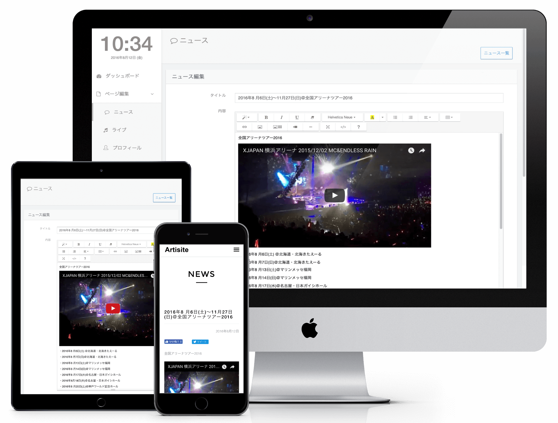 情報発信が重要であることを理解しているアーティストは、Twitter、Facebook、Instagram、ツイキャス、ブログなどを使って、ファンへ情報発信しています。それらSNSは、リアルタイムの情報発信としては有効なサービスですが、時間とともにすぐに情報が流れていってしまいます。これまでとこれからのアーティスト活動を知ってもらうためにはホームページが必須です。しかし、アーティストのサイトの多くは、自分たちで更新しているが難しくてなかなか更新できない、業者に依頼しているがすぐに更新されないなどの理由から、情報更新が少なく、訪れる価値のないものになってしまっています。アーティサイトでは、アーティストのサイトをHTMLなどの専門知識は一切不要で簡単に構築できます。